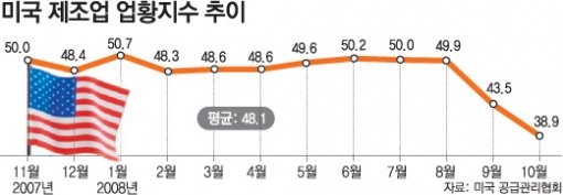 《미국 제조업 경기가 26년 만에 최악의 수준으로 떨어지는 등 실물 경기가 급속도로 악화되고 있다. 미 최대 자동차업체인 제너럴모터스(GM)의 지난달 판매량은 1년 전에 비해 절반 가까이 떨어지는 등 미국 제조업을 대표하는 자동차업계에도 비상이 걸렸다. 금융위기의 영향으로 자금난이 정보기술(IT) 바이오 유통업계 등으로 무차별적으로 확산되고 있어 미국 경기침체가 갈수록 악화될 수 있다는 우려가 나오고 있다.》