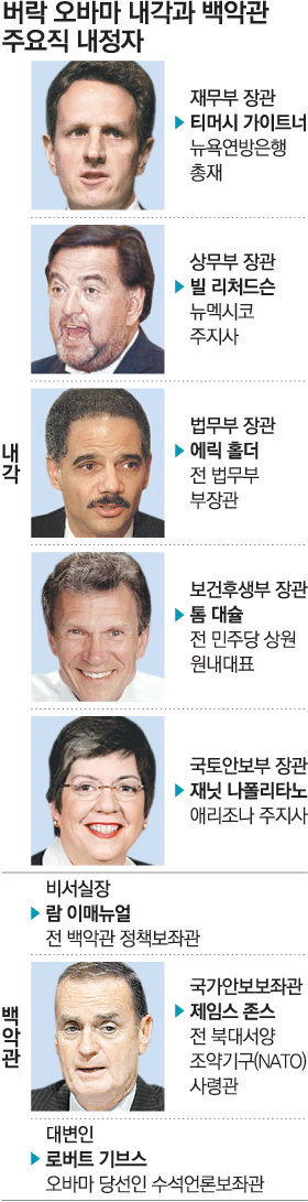 ▽오바마 외교안보팀은 어디로?=오바마 행정부 1기 외교안보팀은 이념보다는 중도성향의 실용이, 실험정신보다는 과거의 경험이 중시될 것이라는 것이 대체적인 평가다. 존스 전 사령관의 내정이나 로버트 게이츠(65) 현 장관의 유임설이 이를 뒷받침한다.