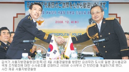 김석기 서울지방경찰청장과 요네무라 도시로 일본 경시총감은 4일 서울경찰청에서 한일 수사실무회의를 갖고 양국 사이버수사 담당부서 사이에 핫라인을 구축해 점점 더 국제화, 광역화되고 있는 사이버 범죄에 공동 대응하기로 합의했다.