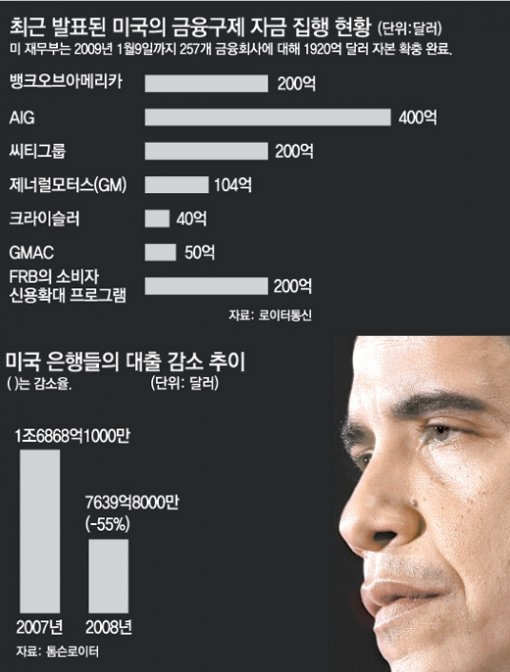 ▽구제금융안은 오바마에겐 ‘편투통’=배드뱅크 설립 방안은 지난해 9월에도 검토된 적이 있다. 하지만 당시에는 “실제 효과를 보기까지 시간이 많이 걸린다”는 이유로 채택되지 않았다. 그 대신 정부는 휘청거리는 은행의 지분을 매입해 주는 방법으로 은행에 자금을 수혈했다.