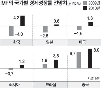 한국은 미국 유럽 일본 등 주요 교역대상국이 줄줄이 마이너스 성장을 할 것으로 예상돼 급격한 수출 감소가 불가피한 데다 내수 기반까지 취약해 글로벌 불황의 직격탄을 맞을 수밖에 없다는 게 IMF의 설명이다. IMF는 올해 한국의 내수 부문이 작년보다 5.1% 줄고, 순수출(수출―수입)은 1.1% 늘어나는 데 그칠 것으로 내다봤다.