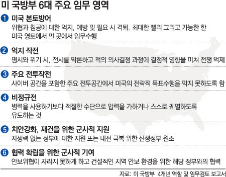 ▽국방부 혼자서는 안 된다=보고서는 국방부의 주요 임무 영역으로 △미국 본토 방어 △억지작전 △주요 전투작전 △비정규전 △치안 강화, 체제 이양 및 재건을 위한 군사적 지원 △협력적 안보체제 확립을 위한 군사적 기여 등 6개 분야를 꼽았다.