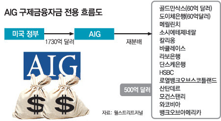 미국 정부가 AIG에 제공한 구제금융 가운데 상당액이 손실 보전 명목으로 미국과 유럽의 대형 금융기관에 흘러들어 간 것으로 확인됐다고 월스트리트저널이 7일 보도했다.