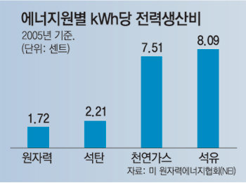지구온난화에 대한 우려가 높아지면서 미국에서는 원자력발전소(원전)가 새 대안으로 급부상하고 있다. 온난화의 주범인 온실가스 배출이 거의 없는 데다 가스나 석유를 연료로 사용하는 화력발전보다 전력생산비용이 획기적으로 낮기 때문이다. 원전의 kWh당 전력 생산비용(2005년 기준)은 가스나 석유의 23%, 21%에 불과하다.
