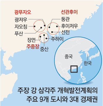 광둥 성 정부는 이를 위해 주장 강 삼각주의 광저우(廣州), 선전(深(수,천)), 주하이(珠海) 등 9개 주요 도시를 세 개의 경제권으로 묶어 개발할 계획이다. 이들 도시는 서로 인접했으나 행정구역으로 나뉘어 있어 기초설비 등이 중복 투자돼 주장 강 삼각주의 발전을 가로막는 요소로 지적돼 왔다.