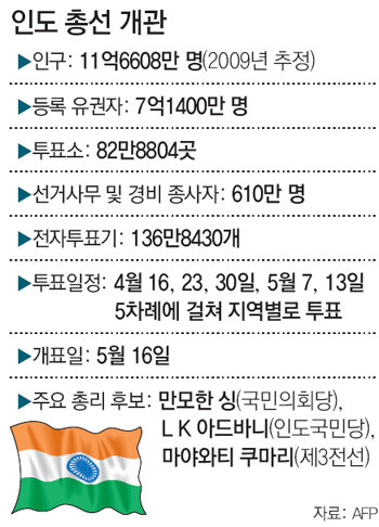 각종 여론조사 결과에 따르면 현 집권여당인 국민회의당과 제1야당인 인도국민당이 나란히 1, 2위를 차지할 것으로 예상되고 있지만 어느 정당도 과반수 득표에는 미치지 못할 것으로 보인다. 국민회의당은 만모한 싱 현 총리(76)를, 인도국민당은 L K 아드바니 총재(81)를 각각 총리 후보로 내세웠다. 반면에 국민회의당과 인도국민당 2강 구도에 도전하는 정치연합인 ‘제3전선’은 ‘불가촉 천민의 여왕’으로 통하는 마야와티 쿠마리 우타르프라데시 주지사(53)를 총리 후보로 밀고 있다.