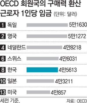 한국보다 구매력 환산 1인당 임금이 높은 나라는 1위인 독일(5만1630달러)을 비롯해 영국(5만1272달러) 룩셈부르크(4만9488달러) 네덜란드(4만8218달러) 노르웨이(4만7535달러) 스위스(4만6031달러) 벨기에(4만5750달러) 등 유럽의 선진국뿐이었다.