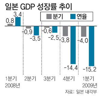 수출은 전 분기 대비 26.0% 줄었다. 감소 폭은 지난해 4분기(―14.7%)의 두 배에 가깝다. 향후 성장전망을 가늠할 수 있는 기업 설비투자 또한 10.4% 줄어드는 등 모든 지표가 전후 최악이었다. 일본 경제를 지탱해온 수출산업이 글로벌 경제위기의 직격탄을 맞은 데 이어 국내소비 또한 극심하게 위축됐기 때문이다.