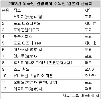 일본의 여행 전문 사이트가 ‘외국인이 가장 주목한 일본의 관광지’를 조사한 결과 도심 수산물 시장인 쓰키지(築地)시장이나 테마파크인 도쿄 디즈니랜드, 포케몬센터도쿄 등이 전통적인 명승지 긴카쿠(金閣)사보다 상위를 차지했다고 아사히신문이 29일 보도했다.
