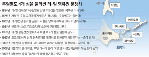일본과 러시아가 다음 달 초순 정상회담을 앞두고 쿠릴열도 남단 4개 섬 영유권 문제를 놓고 서로 기선잡기에 나섰다. 아소 다로(麻生太郞) 일본 총리가 최근 “러시아가 불법으로 점거하고 있다”고 주장하자 드미트리 메드베데프 러시아 대통령은 즉각 “러시아의 주권을 문제 삼으면 교섭을 제대로 할 수 없다”며 으름장을 놓았다. 반세기 넘게 분쟁을 벌여온 영유권의 해법 찾기가 최근 속도를 내면서 벌어진 양상이다.