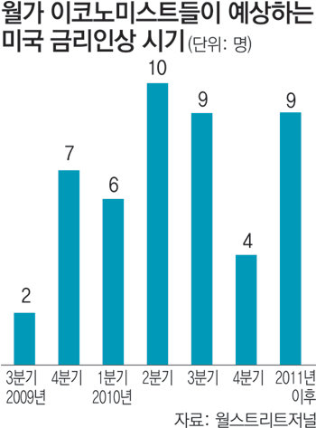 월가에서는 미국 정부와 FRB가 당장 금리인상 등 출구전략을 이행하지는 않을 것으로 보고 있다. 최근 월스트리트저널이 월가 이코노미스트 47명을 대상으로 한 설문조사에서 올해 3분기(7∼9월)와 4분기(10∼12월)에 미국 금리가 인상될 것이라는 응답은 각각 2명, 7명에 불과했다. 내년 금리인상을 점친 이코노미스트는 29명이었고, 9명은 2011년 이후에 금리가 인상될 것으로 내다봤다.