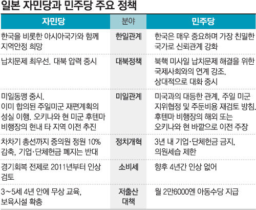 한일관계에서는 양당에 큰 차이가 없다. 역대 자민당 정권에서 한일관계는 부침을 거듭했지만 현재 아소 다로(麻生太郞) 정부와는 과거 어느 때보다 사이가 좋다. 아소 내각이 들어선 작년 9월 이후 10개월 동안 이명박 대통령과 아소 총리는 7차례나 정상회담을 가지며 친분을 쌓았다. 민주당도 대외관계에서 한국을 매우 중시한다. 하토야마 유키오(鳩山由紀夫) 대표는 올 5월 취임한 후 첫 외국 방문지로 한국을 택했고, 총리가 되면 야스쿠니(靖國)신사 참배를 하지 않겠다는 뜻을 밝혔다. 그는 90세 노모가 한류 팬이라는 점을 공개 석상에서 말하기도 한다. 그와 함께 민주당 3인방인 오자와 이치로(小澤一郞) 대표대행과 오카다 가쓰야(岡田克也) 간사장도 한국에 우호적이다. 주일 한국대사관 측이 “민주당 정권이 되더라도 한일관계가 더 좋아지면 좋아졌지 나빠지지는 않을 것”이라고 전망하는 것은 이 때문이다.