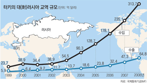 냉전이 끝난 뒤에도 한동안 껄끄러웠던 터키-러시아 관계가 최근 급속도로 가까워지고 있다. 영국의 경제주간 이코노미스트 최신호는 “오랜 앙숙이던 터키와 러시아가 새로운 동반자가 됐다”며 “서로의 필요에 의해 구성된 터키-러시아 동맹에 대해 미국과 유럽 등이 의심의 눈초리를 보내고 있다”고 전했다. 2005년부터 시작된 터키의 끈질긴 구애에도 불구하고 유럽연합(EU)이 이슬람국가인 터키를 회원국으로 받아들이지 않고 있는 사이에 러시아는 그동안 쌓아올린 터키와의 경제협력을 바탕으로 유럽과 아시아를 연결하는 지정학적 중요성을 가진 터키를 자기편으로 끌어들이고 있는 것이다. 터키의 영자 일간지 ‘투데이스 자만’은 “터키와 러시아는 상반기 6개월 동안 5차례의 고위급 방문을 성사시켰다”며 “양국 관계가 전례가 없을 정도로 빠르게 가까워지고 있다”고 전했다.