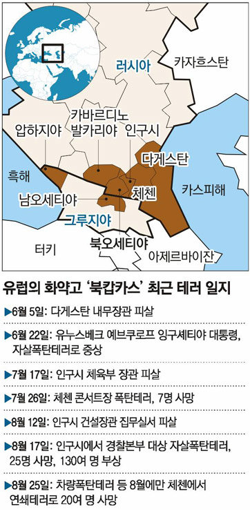 지난달 17일 인구시에서는 경찰본부를 노린 자살폭탄테러가 발생해 어린이 9명을 포함해 25명이 숨졌다. 체첸에서도 지난달에만 6차례 연쇄테러로 20여 명이 사망했다. 6월에는 유누스베크 예브쿠로프 인구시 대통령이 자살폭탄테러로 중상을 입었고 장관들이 줄줄이 피살됐다.