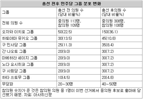 당내 주요 8개 그룹은 총선을 계기로 모두 소속 의원 수를 늘렸지만 오자와 그룹의 약진에는 미치지 못했다. 8개 그룹 간 순위도 바뀌었다. 차기 총리인 하토야마 유키오(鳩山由紀夫) 그룹은 30명에서 약 45명으로 늘었다. 그러나 오자와 그룹의 3분의 1도 안 되는 덩치다. 당내 비중은 총선 전 13.5%에서 10.8%로 오히려 줄었다.