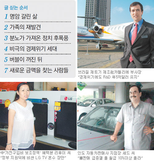 브라질과 중국 역시 내수 성장세가 눈부시다. 중국 농촌 여성 리후이(李輝·23) 씨는 “경제위기라지만 중국의 생활수준은 계속 높아지고 있는 것 같다”며 흐뭇해했다. 결혼을 앞둔 리 씨는 정부의 도움으로 혼수품을 싸게 구입할 수 있었다. 중국은 농촌지역 거주자들이 가전제품을 살 때 구입비를 보조해 주는 ‘가전하향(家電下鄕)’ 정책을 펴고 있다. 리 씨는 “가전하향 정책으로 평소 부담스러웠던 가격의 LG TV를 혼수품으로 살 수 있게 돼 무척 기쁘다”고 말했다.