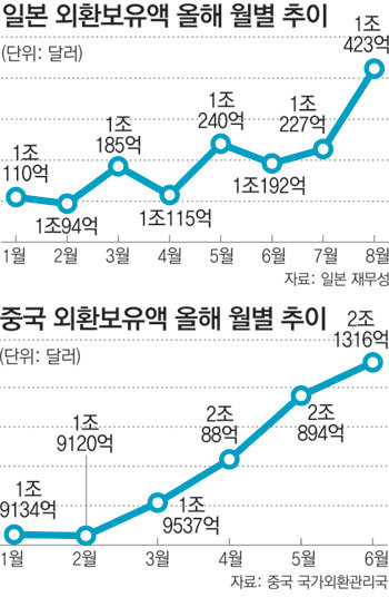 7일 일본 재무성에 따르면 8월 외환보유액은 7월보다 197억 달러가 늘어난 1조423억 달러였다. 이는 그간 사상 최대기록이었던 지난해 말 1조306억 달러보다 100억 달러 이상 늘어난 것이다. 외환보유액은 수입대금을 결제하거나 대외채무 상환 등에 대비해 정부가 준비하고 있는 외화표시 자산이다. 달러나 유로 등 외화예금과 해외채권이 주를 이루지만 금이나 IMF의 SDR도 외환보유액으로 잡힌다.