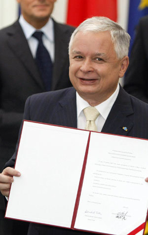 카친스키 대통령은 이날 바르샤바 대통령궁에서 EU이사회 순회 의장국인 스웨덴의 프레드리크 레인펠트 총리, 조제 마누엘 두랑 바호주 EU 집행위원장 등이 참석한 가운데 리스본 조약에 최종 서명했다.