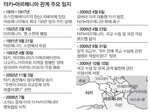 아흐메트 다부토글루 터키 외교장관과 에두아르드 날반디안 아르메니아 외교장관은 10일 스위스 취리히에서 국교 수립 및 양국 관계 발전에 관한 의정서에 서명했다고 AP통신이 보도했다. 양국은 의회의 비준을 받은 뒤 두 달 안에 1993년부터 폐쇄돼온 국경을 다시 개방하기로 했다.