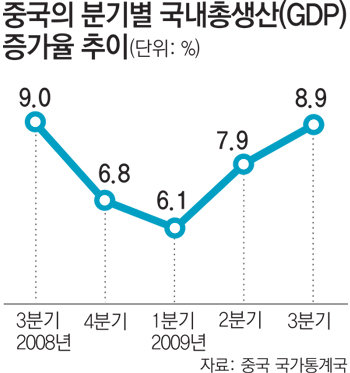 중국의 올해 3분기 국내총생산(GDP) 증가율이 8.9%를 기록하며 올 들어 2분기 연속 증가세를 보였다. 중국 국가통계국은 22일 1∼3분기 증가율이 7.7%로 나타나 올해 목표로 했던 8% 성장은 무난히 달성할 것으로 전망했다. 3분기 성장률은 1년 만에 최고치로 지난해 하반기 이후의 글로벌 금융위기에서 회복된 것으로 보인다.