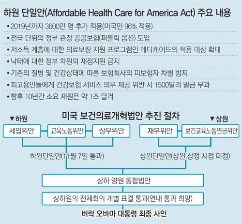 이날 통과된 하원 단일안은 오바마 대통령의 기본 구상을 충실히 반영한 작품이라는 평가를 받는다. 2019년까지 보험 수혜 대상을 3600만 명 늘려 전 국민의 96%까지 확대 적용하는 내용을 담았다. 또 정부가 관장하는 공공보험(퍼블릭 옵션)을 도입하되 지불 수가는 정부가 병원 및 의사와 협상하도록 했다.