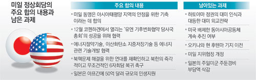 두 정상은 내년 미일 안보조약 개정 50주년을 맞이하는 만큼 양국 간 동맹관계를 한층 강화하자는 데도 의견을 함께했다. 대등한 대미 외교를 주창하고 있는 하토야마 총리 집권 이후 소원해진 양국 관계를 ‘미일 동맹’ 정신에 기초해 회복하자는 의미다.