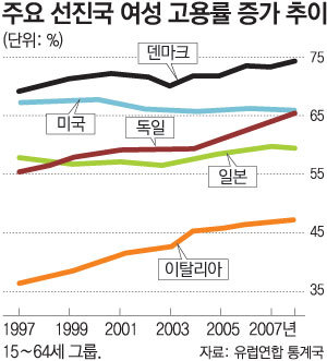 대표적인 사례는 여성에게 집중되기 시작한 일자리. 유럽에서 2000년 이후 생겨난 일자리 800만 개 중 600만 개가 여성에게 돌아갔다. 미국에서도 지난해 생겨난 일자리의 절반이 여성 몫이었다. 반면 경제위기 이후 실직자 4명 중 3명은 남성이었다.