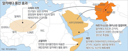 그동안 아프간과 파키스탄에 근거지를 두었던 알카에다가 소말리아와 예멘 등지에 연계조직을 거느리고 중동과 북아프리카 지역별로 영향력을 넓히며 탈집중화 전략을 구사하고 있어 미국 등 서방국가들이 바짝 긴장하고 있다.