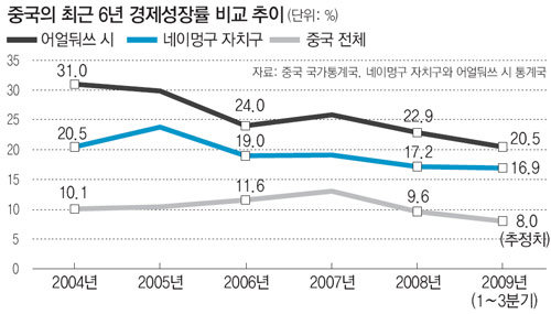 네이멍구 자치구는 최근 7년간 경제성장률이 중국에서 가장 높았다. 지난해 금융위기 영향 속에서도 네이멍구는 16.9%(1∼3분기) 성장해 중국 전체 성장률 전망치 8.0%보다 2배가량 높다. 이 자치구에서도 성장률이 가장 높은 곳이 어얼둬쓰다. 글로벌 금융위기의 여파가 세계를 휩쓸었지만 어얼둬쓰는 2008년 22.9%에 이어 지난해에도 20.5%의 초고속 성장을 한 것으로 자치구 정부는 보고 있다.