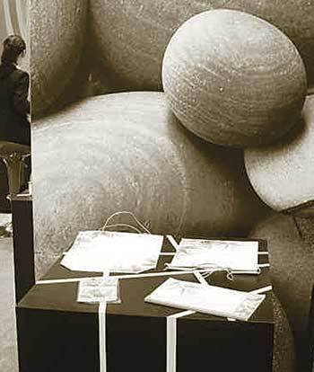 외국의 한 전시회에 선보인 중국의 ‘돌종이’. 돌 사진을 배경으로 탁자에 올려져있는 넉 장의 하얀 종이가 석회를 주성분으로 한 ‘돌종이’이다. 사진 출처 구글차이나