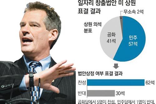 사실 이날 워싱턴의 의회의사당에선 민주당의 일자리 창출 법안의 운명을 아는 사람이 드물었다. 이 법안은 민주당 원내대표인 해리 리드 의원(네바다)이 내놓은 것이다. 그는 일자리 창출 지원 항목과 관련해 법안 수정을 요구하는 공화당의 요구를 묵살해 공화당의 반발을 샀었다. 매사추세츠 주 상원의원 선거 패배로 공황 상태에 빠졌던 민주당은 앞서 이달 초 맥스 배커스 의원(민주·몬태나)과 찰스 그래슬리 의원(공화·아이오와)이 공동으로 내놓은 85억 달러 규모의 초당적 일자리 창출법안을 놓고 고민했다. 하지만 민주당 리드 원내대표는 당초 오바마 대통령이 제안한 것보다 축소된 이 법안을 거부했다. 그 대신 자신이 제출한 150억 달러의 상원 법안을 밀어붙이기로 결정했다. 법안은 실직자를 고용한 회사에 130억 달러의 세금을 감면해 주고 새 일자리를 1년 동안 유지하는 근로자에게 1000달러씩 세금혜택을 주는 내용을 담았다.