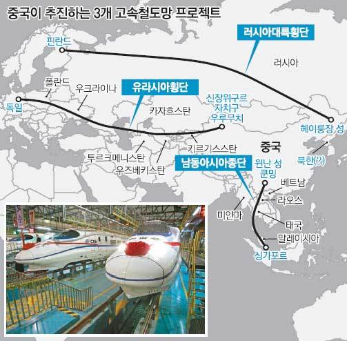 중국은 △유라시아 횡단 △동남아시아 종단 △러시아대륙 횡단 등 3개 고속철도망을 구축하는 계획과 관련해 이미 주변국들과 기술적인 협상에 착수했다고 왕 교수는 전했다.