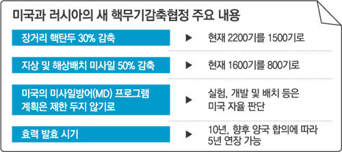 두 정상이 합의한 새 핵무기감축협정은 지난해 12월 만료된 전략무기감축협정(START-1)을 대체하는 것이다. 큰 뼈대는 현재 2200기의 장거리 핵탄두를 30% 감축해 1500기로 줄이고 지상 및 해상배치 미사일 등을 기존의 1600기에서 절반인 800기로 감축하는 것이다. 두 나라는 계획대로 핵무기 감축을 이행했는지에 대한 검증시스템도 구축할 계획이다.