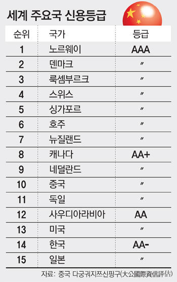 중국 신용평가기관인 다궁궈지쯔신핑구(大公國際資信評고)가 12일 발표한 ‘50개국 신용등급 보고’에서 중국의 위안화채권 신용등급은 AA+로 미국의 달러채권 등급 AA보다 한 단계 높았다고 관영 신화통신이 12일 보도했다. 순위로는 중국이 10위, 미국은 13위였다. 한국의 원화채권 등급은 AA―(14위)로 일본 영국 프랑스 등과 같았지만 순위는 앞섰다.
