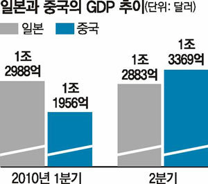 2분기(4∼6월) 일본의 국내총생산(GDP)이 처음으로 중국에 역전돼 세계 2위 경제대국 자리를 중국에 내줬다. 일본이 1968년 독일(당시 서독)을 제치고 세계 2위에 오른 지 42년 만이다.