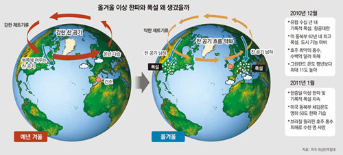 우리나라만 ‘북극 추위’에 시달리는 게 아니다. 올겨울 미국과 유럽 등 북반구 곳곳이 이례적인 폭설과 한파에 시달리고 있다. 지난해 12월과 이달 초 60cm 이상의 폭설이 미국 동북부를 강타해 뉴욕을 포함한 여러 대도시의 기능을 마비시킨 데 이어 24일에는 체감온도 영하 50도에 육박하는 한파가 다시 덮쳐 휴교령까지 내려졌다. 유럽도 한파와 폭설로 동사자가 속출하고 항공대란에 시달리고 있다. 세계의 기상학자들은 갑자기 닥친 한파의 원인, 지구환경 문제와의 연관성을 밝혀내기 위해 부심하고 있다.