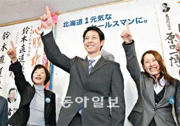 24일 일본 홋카이도 유바리 시 지방선거에서 최연소 시장에 당선된 스즈키 나오미치 씨(가운데)가 지지자들과 함께 기쁨을 나누고 있다. 이곳 주민들은 도쿄도 공무원이던 스즈키 씨가 보여준 헌신적인 유바리 사랑에 매료돼 그에게 시장 출마를 권했다. 아사히신문 제공
