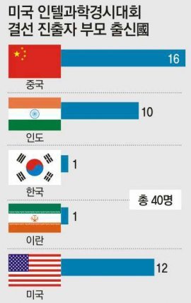 전미정책재단(NFAP)이 25일 발표한 보고서에 따르면 이 대회 최종 결선 진출자 40명 가운데 70%인 28명이 중국(16명)과 인도(10명) 등 아시아 지역 이민자 자녀다. 한국과 이란 출신은 각각 1명이었으며, 미국 출생 부모의 자녀는 12명이었다. 보고서는 최종 결선 진출자의 부모들을 면접 조사해 작성됐다.