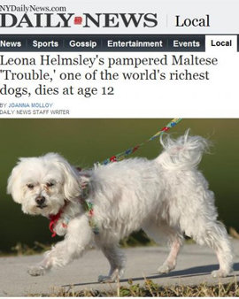 2007년 미국 호텔 업계의 거물 리오나 헴슬리의 타계로 1200만 달러(약 130억원)의 유산을 받은 말티즈 종 암컷 애완견 '트러블'이 지난해 12월 죽은 것으로 알려졌다.