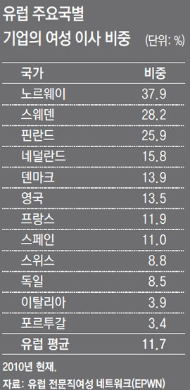 유럽 기업들의 이사회 여성 비율은 평균 11.7%. 이사회 의장 비율은 훨씬 더 떨어져 3%에 불과하다. 미국도 사정은 다르지 않다. 포브스에 따르면 미국 대기업 여성 이사는 전체의 12% 선이고 상장(上場) 대기업의 30%가량은 여성 이사가 한 명도 없다.