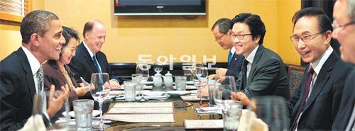 정상회담이 끝난 뒤 미 행정부 내 권력서열 2, 3위인 조지프 바이든 부통령과 클린턴 국무장관은 공동으로 이 대통령을 국무부 국빈오찬에 초대했다. ‘포기 보텀(Foggy Bottom·안개 낀 포토맥 강가 저지대)’이라는 별칭을 지닌 국무부의 8층 벤저민 프랭클린 룸에서였다.