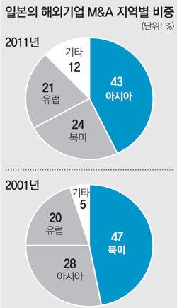 일본은 거품경제 논란이 있던 1980년대 말에 해외 M&A에 눈뜨기 시작해 정보기술(IT) 호경기인 2000년과 글로벌 금융팽창기인 2008년에도 M&A 붐이 있었다. 일본의 해외 M&A는 과거에는 주로 미국과 유럽 기업이 대상이었지만 이제는 아시아 중동 남미 등 고성장 신흥경제국으로 확대되는 점에서 차이가 있다. 올해 성사된 M&A 중 중국 인도 싱가포르 등 아시아 기업이 43%를 차지했다. 10년 전 47%였던 북미 기업은 올해는 24%로 줄었다.