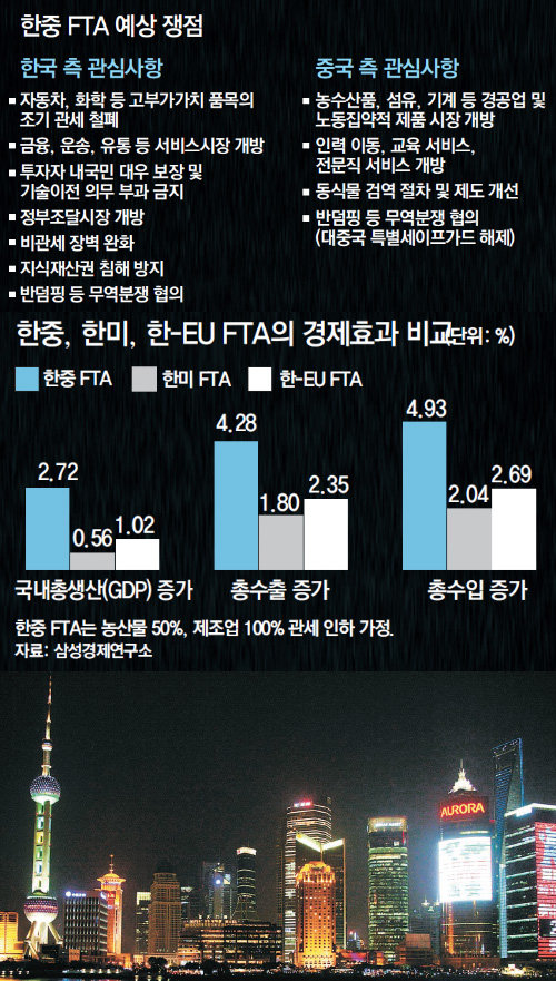 《 한중 양국 정상이 자유무역협정(FTA) 협상을 개시하기로 합의하면서 한중 FTA 시대가 가시화되고 있다. 2004년 한중 통상장관이 민간공동연구에 들어가기로 합의한 지 8년 만에 FTA 체결을 위한 논의가 본격화되는 것이다. 경제규모 세계 2위이자 한국의 최대 무역상대국인 중국과의 FTA는 국내 산업은 물론이고 안보 및 국민 일상생활 전반에 막대한 영향을 미칠 것으로 보인다. 제조업 수출 증가와 중국 시장을 선점하는 발판이 될 수 있다는 점은 한중 FTA의 가장 큰 매력이지만 그만큼 위험요소도 높다. 이에 따라 본협상에 들어가더라도 농업 등 민감한 주제를 놓고 수년간 협상이 표류할 개연성이 매우 높다는 관측이 많다. 농업 분야 협상만으로도 길게는 5, 6년이 걸릴 수 있다는 전망도 나온다. 한국 경제에 시험대가 될 한중 FTA 체결에 따른 명암을 정리한다. 》 기대① 관세 인하로 제조업 수출 크게 늘 듯