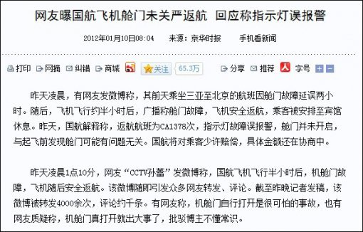 지난 9일 아이디 ‘CCTV**’의 네티즌은 자신의 웨이보(중국판 트위터)에 “8일 저녁 싼야공항에서 베이징으로 가는 CA1378 비행기가 이륙한지 30분 만에 화물칸에 문이 열려 회항했다”는 글을 게재했다.