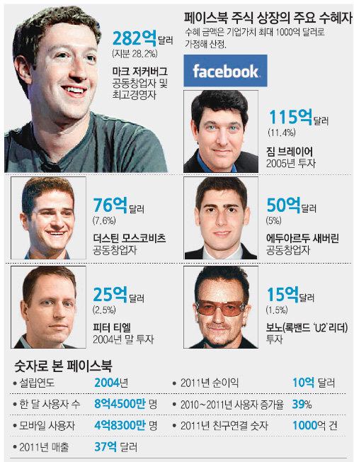 2004년 미국 하버드대 기숙사에서 친구와 함께 재미삼아 페이스북을 만든 마크 저커버그(28). 여자친구의 사생활을 여기에 올려 이별의 아픔을 맛보기도 했던 그가 8년 만에 세계적 부호가 됐다. 세계 인터넷업계가 가슴을 졸이며 기다려온 페이스북의 기업공개(IPO·주식상장)를 통해서다.