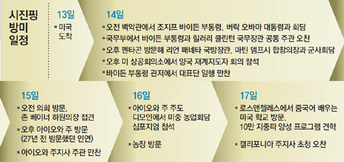 15일에는 의회를 찾아 상하원 의회 지도자를 만난 후 오후에 아이오와 주로 날아간다. 27년 전인 1985년 허베이(河北) 성 정딩(正定) 현 당서기로 축산대표단을 이끌고 양돈 기술을 배우기 위해 머스카틴을 방문한 적이 있는 시 부주석은 이번에는 톰 빌색 미 농림장관과 게리 로크 주중 미 대사의 안내로 이곳을 찾는다. 또 미국 측은 시 부주석의 아버지가 1980년 미국을 방문했을 때의 사진들을 모아 만든 사진첩을 선물로 준비했다.