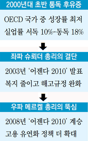 2000년대 초 독일은 통일 후유증으로 경제협력개발기구(OECD) 회원국 중 최저 성장률을 기록한 ‘유럽의 병자(病者)’였다. 실업률은 서독이 10%에 가까웠고 동독은 18%를 넘겼다.