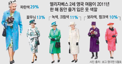 엘리자베스 2세 영국 여왕(86)의 패션 코드는 ‘파란색’이었다. 패션잡지 보그 영국판 5월호는 2011년 한 해 동안 여왕이 공식석상에서 입은 옷의 색상을 모두 분석한 결과 파란색(29%) 비율이 가장 높았고 꽃무늬(13%), 녹색, 크림색(이상 11%)이 각각 뒤를 이었다고 보도했다. 또 여왕은 상의와 하의, 모자 등의 색깔을 통일하는 패션감각을 뽐내기도 했다. 베이지색과 체크무늬 의상은 각각 1%에 불과해 여왕이 가장 기피한 색상으로 보인다. 1993년부터 여왕의 의상을 담당하고 있는 앤절라 켈리 씨(59)는 “여왕은 내 의견을 최대한 존중하지만 최종 결정은 오직 ‘여왕의 몫’”이라며 의상에 대한 여왕의 ‘전문가적 식견’을 높이 평가했다.