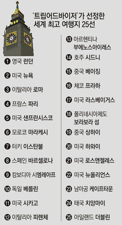 세계 여행자들이 꼽은 올해의 최고 여행지로 영국 런던이 선정됐다. 세계 최대 여행 사이트인 ‘트립어드바이저’는 1일 수백만 명의 사이트 회원을 상대로 실시한 여행지 인기도와 평가를 토대로 ‘여행자들이 선택한 여행지’ 25곳에서 런던이 1위를 차지했다고 발표했다.