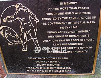 미국 뉴저지 주 팰리세이즈파크 시의 시립도서관 앞에 세워진 일본군 위안부 기림비에 일본제국주의가 20만 명 이상의 여성을 납치했다고 기록되어 있다. 동아일보DB